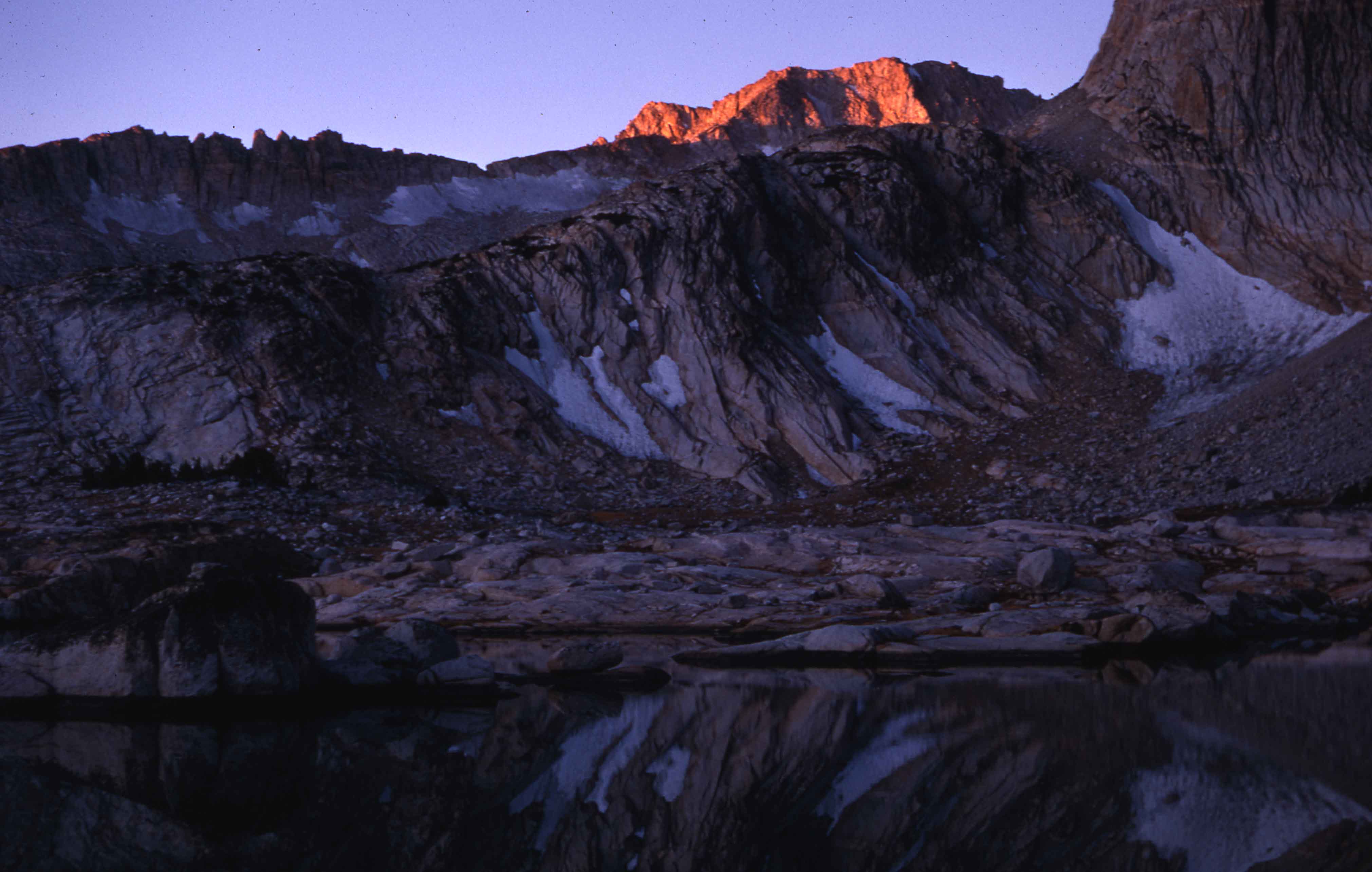 Sunrise on Mt. Conness shoulder. [Photographer]: N. Baggott [Nancy Baggott]. 1968. ORIGINAL. Mountains. Yosemite Original. A-2233. A-29-f-1. A-24-10-043