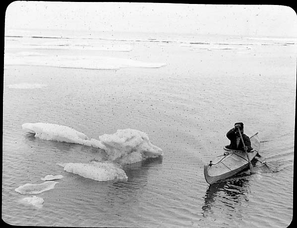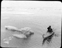 Eskimo "Lou" in Kyak by ice, Flaxman Island, Alaska, August 1, 1913