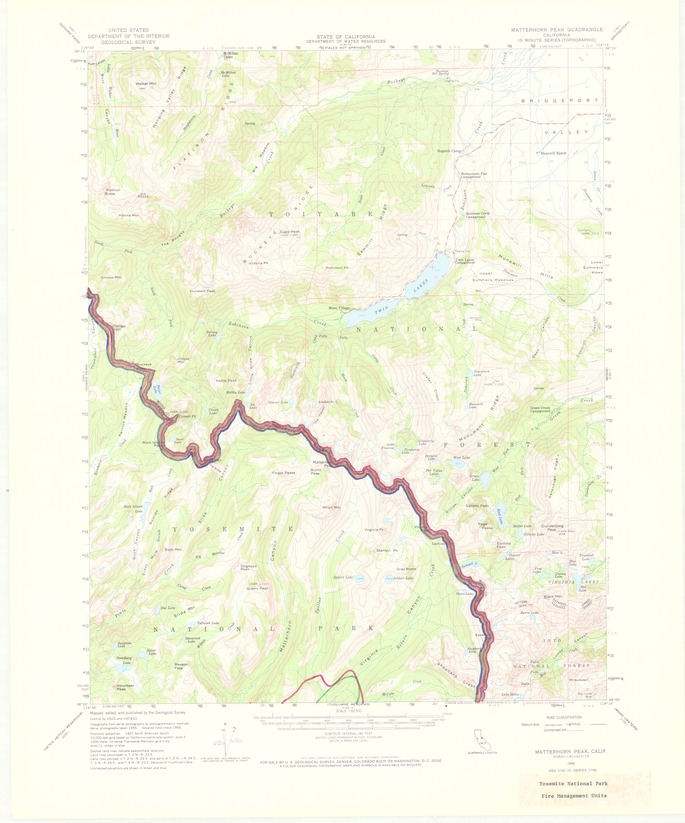 Topographic map of the Matterhorn Peak Quadrangle with multicolored lines indicating fire management units