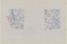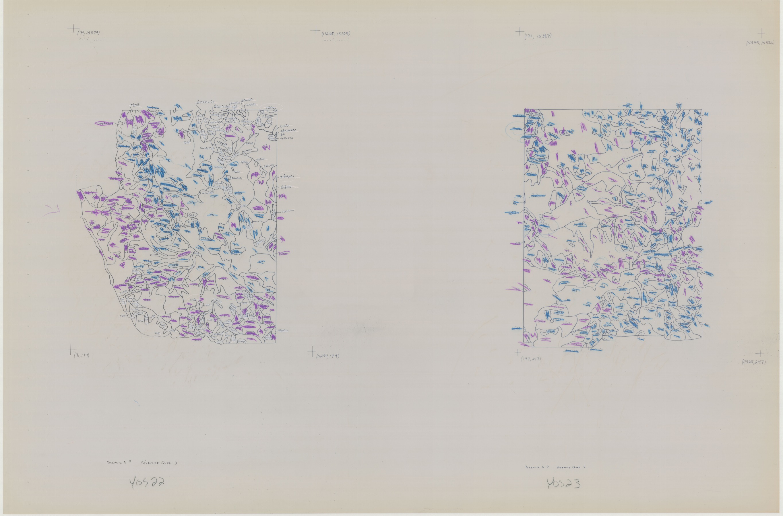 Aerial view map of the Yosemite quadrants with geographic features crossed out, coordinates, and notes