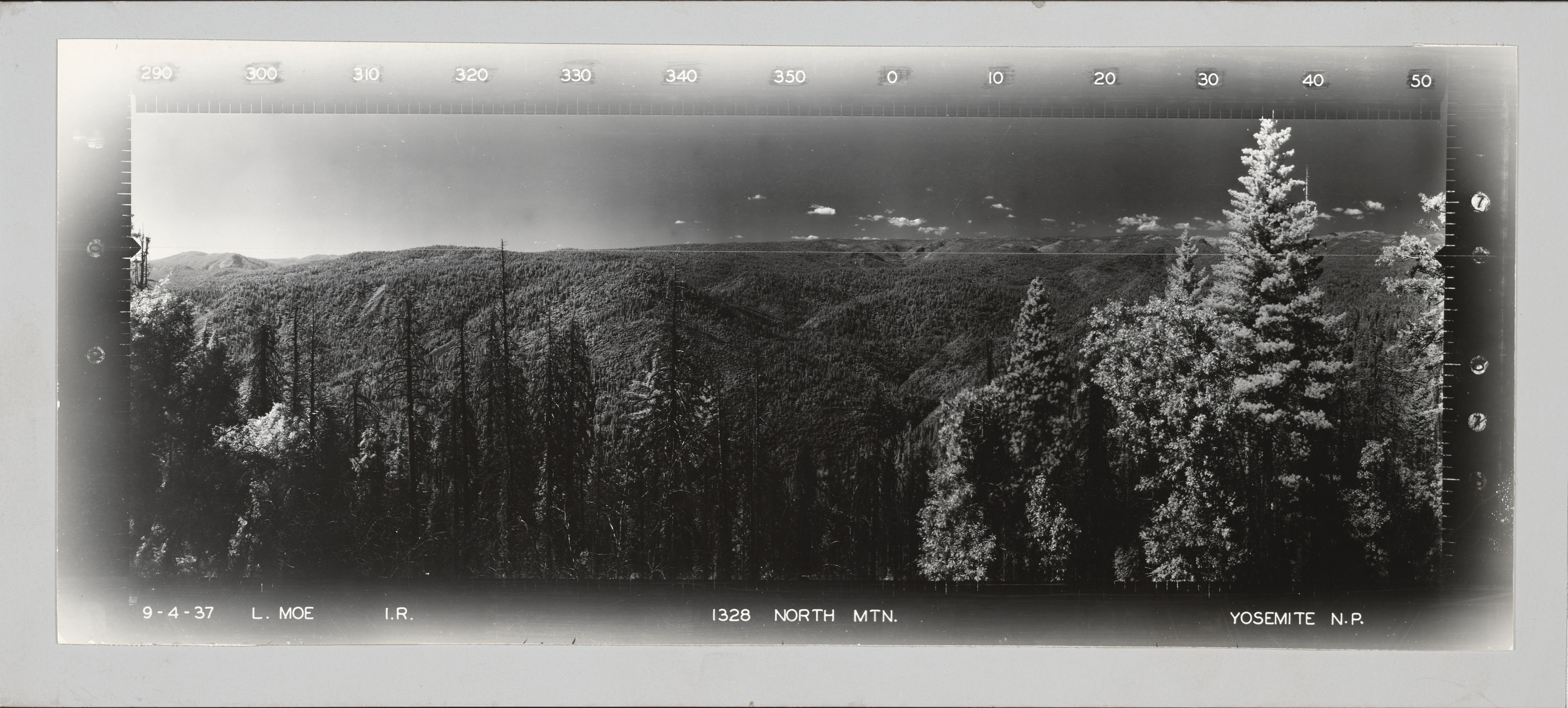 This series consists of a set of forty panoramic photographs taken from fire lookouts and lookout points (proposed lookout sights) in Yosemite National Park. Most photographs were taken in 1934, though a few date to 1937. They appear to be part of a U.S. Forest Service (USFS) project conducted around this time, although scant documentation about the photographs and about the USFS project exists in the National Park Service (NPS) archives. Accompanying the images is a letter to Superintendent C.G. Thomson of Yosemite National Park, dated 1935 and signed by the project photographer, Lester M. Moe, USFS forester/photographer. The letter lists the panoramic photographs to be donated to a variety of Yosemite locations and is paired with a distribution list that outlines the specific photographs to be given to each ranger station, office, and lookout in Yosemite National Park and in Sierra and Stanislaus National Forests. The letter and envelope mention enclosed vertical angle scales (to assist with image viewing), but these are not present in the collection. Lookout points in Yosemite National Park contemporaneous with these photographs were the Merced Grove (Crane Flat) Lookout, Aspen Valley Lookout, Henness Ridge, Signal Peak, Pilot Peak, Smith Peak, Sentinel Dome, Bald Mountain, Wawona Point, and Wood’s Ridge.