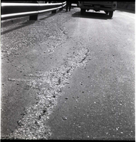 BW photos of rock slides in Kolob Canyons - 2x2. Ranger with camera reaching into crack in the road. ; ZION Museum and Archives Image 107_06_23012 ; ZION 15933