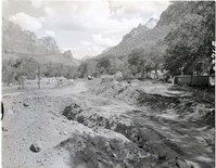 Trailer house area, near old Civilian Conservation Corps (CCC) site (Watchman Housing Area and old helipad area). East side of the Virgin River from South Campground. ; ZION Museum and Archives Image 004_03_035 ; ZION 13768