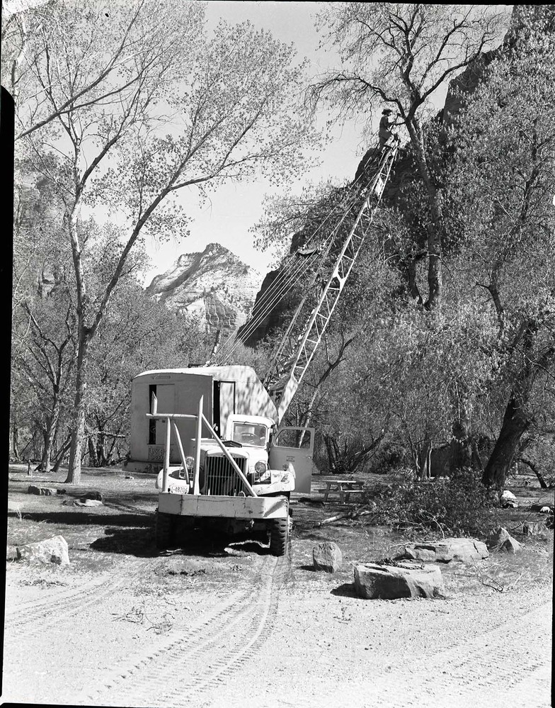 Crane being used in pruning cottonwoods in Grotto Campground. ; ZION Museum and Archives Image 107_02_006 ; ZION 8409