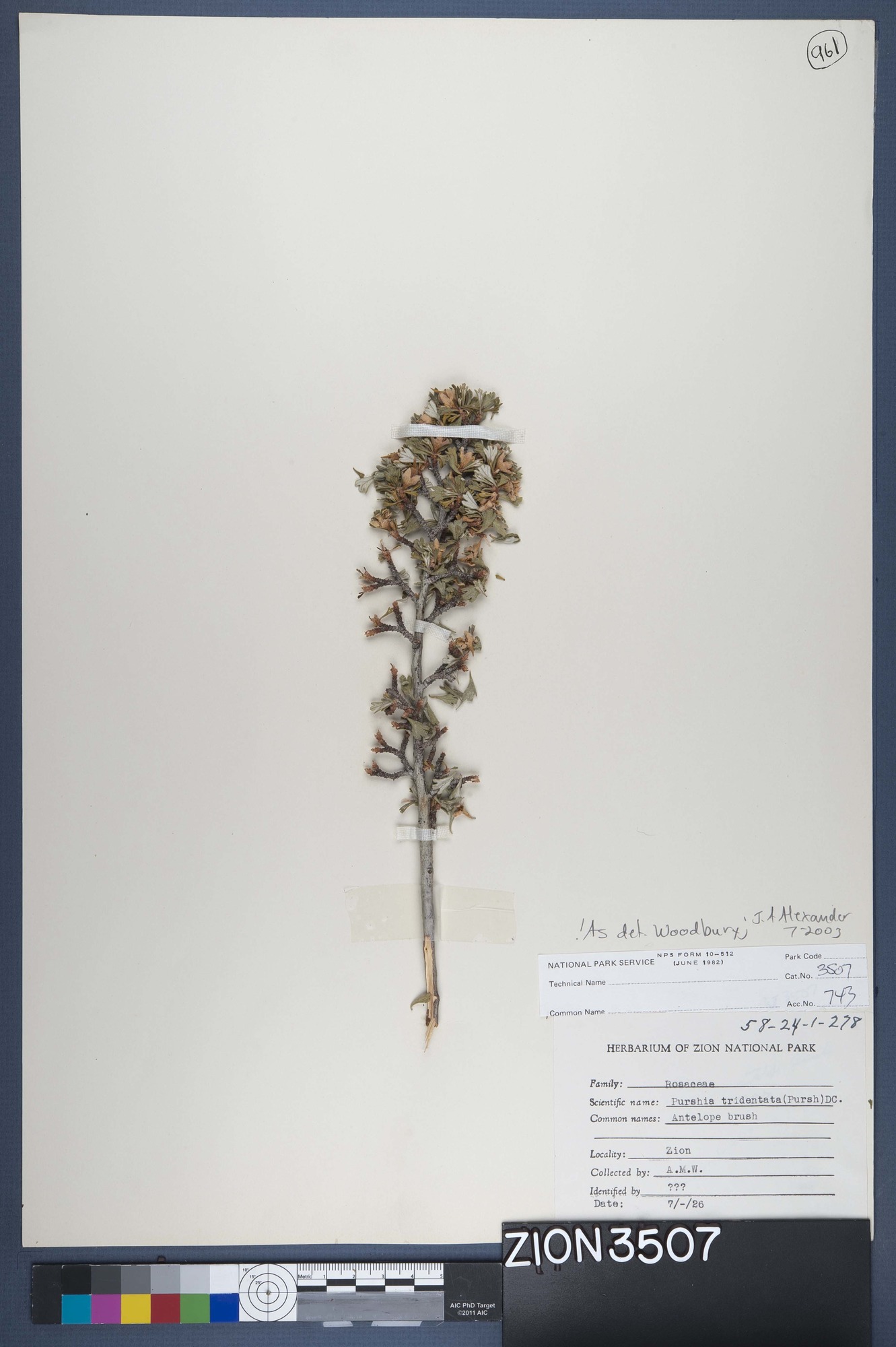 Purshia tridentata, Antelope bitterbrush. Collected by Angus M. Woodbury, 07-01-1926. Catalogued by Margaret Malm, 1988.
