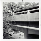 Workers place pipe on side of bridge during the Watchman housing utility project. ; ZION Museum and Archives Image 006.04.13-14of17 ; ZION 15933