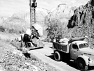 Hauling rocks for revetment work to control Virgin River flood damage by erosion protection works. ; ZION Museum and Archives Image ZION 8366 ; ZION 8366