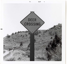 Road sign reading 'Deer Crossing' in Kolob Canyon. ; ZION Museum and Archives Image 007.01.01-43of73 ; ZION 15933