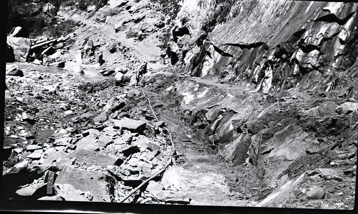 Narrows Trail construction, station 29-50, with view of dry wall, overhanging rock, and travertine limestone cut. ; ZION Museum and Archives Image 008_03_029 ; ZION 13607