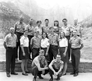 Interpretation division staff, summer 1970, left to right, back: Alberding, McComb, Courand, Lewis, DeMille, Devine, Sandberg; front: Foster, Johnson, Grossman, Haines, Holbert, Tidwell, Smith; front kneeling: Benjamin, Stuart. ; ZION Museum and Archives I