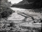Original construction of protective dam for 6' cast iron pipe across the Virgin River. ; ZION Museum and Archives Image 006_04_033 ; ZION 13703
