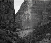 Area of canyon wall that released and caused slide. Birch Creek. ; ZION Museum and Archives Image 107_06_27008 ; ZION 15933