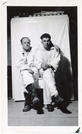 B&W IMAGE OF ZION C.C.C. MEN MAX PETERSON (HEAVY EQUIP. OPERATOR) & JOHN (FERRY?) LITTLE, CAMP BARBER. BOTH MEN DRESSED IN WHITE COVERALLS & SEATED IN FRONT OF DRAPED SHELVES IN THE CAMP INFIRMARY. "JOHN LITTLE/ MAX L. PETERSON" HANDWRITTEN ON REVERSE. FROM THE COLLECTION OF FORMER ZION C.C.C. WORKER MAX L. PETERSON. FINGERPRINTS, SMUDGES, AND DISCOLORATION. IMAGE: 4" X 2-3/8"NEGATIVE LOCATED FOR ZION-00910 ZION 12183.1 AS ZION 901/01_05