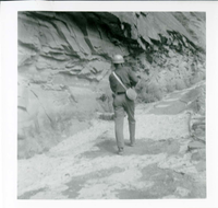 Man standing above West Rim trail damage. ; ZION Museum and Archives Image 008.01.01-1of25 ; ZION 15933