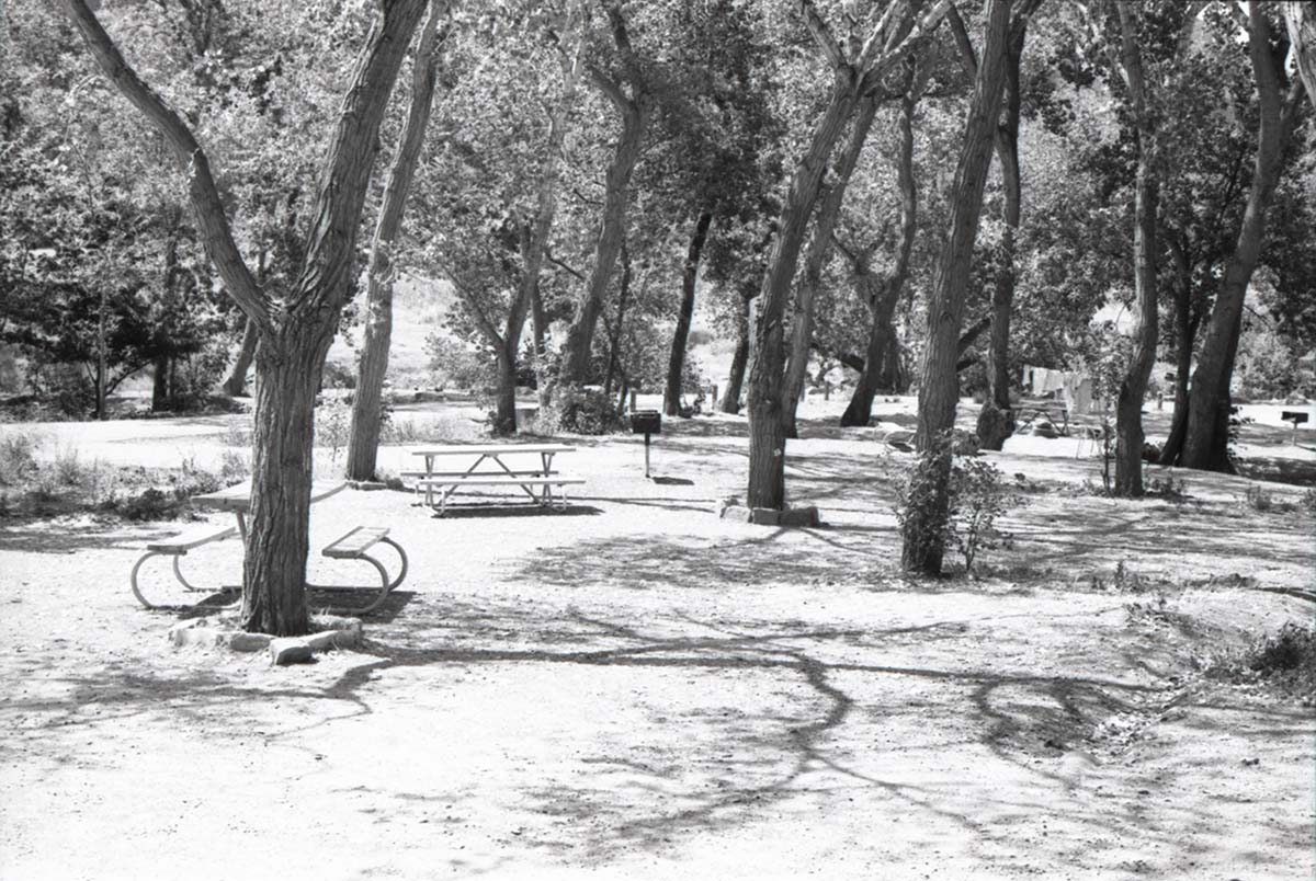 Campsite with picnic table and grill in the South Campground. ; ZION Museum and Archives Image 003.01.03-7of21 ; ZION 15933