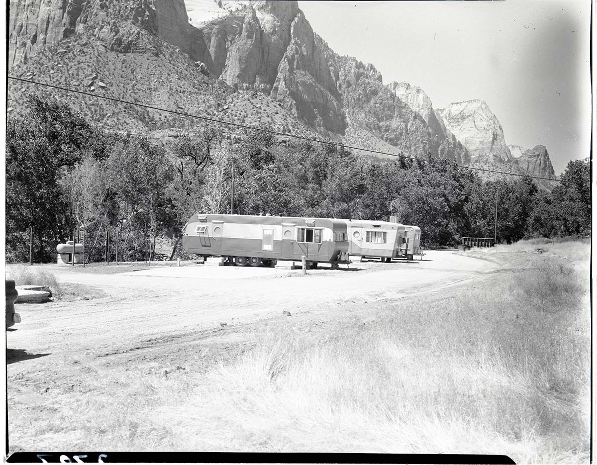 Row of trailer houses in former Civilian Conservation Corps (CCC) area. ; ZION Museum and Archives Image 004_03_041 ; ZION 7852