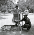 Men using wheelbarrow to work on Great White Throne parking area. ; ZION Museum and Archives Image 002.03.02-2of8 ; ZION 15933