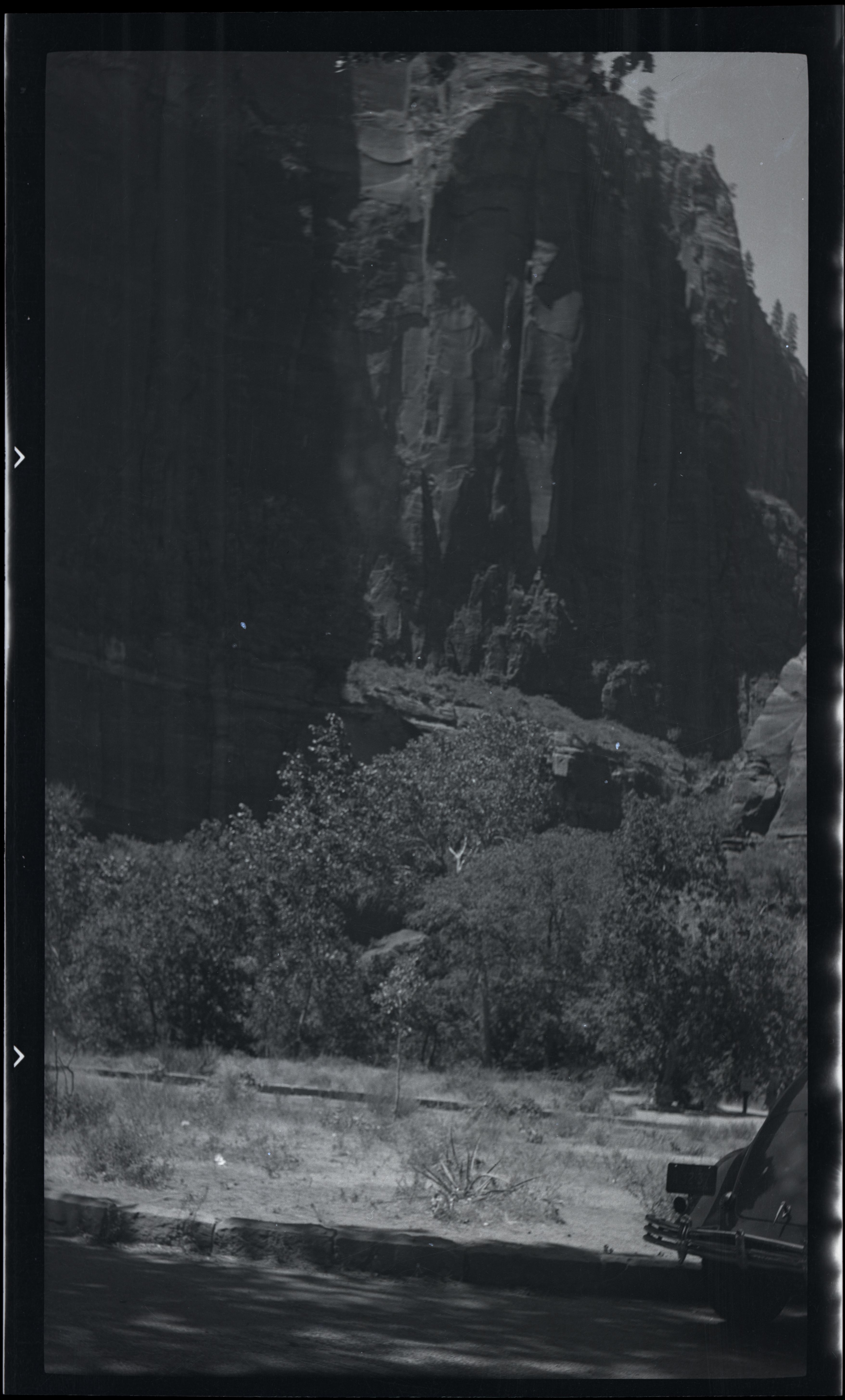 Nitrate negative of canyon walls and vegetation from the Zion Canyon Scenic Drive. Tail end of car. ; BRCA Museum and Archives Image BRCA8875_001_094 ; BRCA 8875