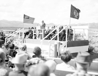 Warren F. Hamilton, Superintendent of Zion National Park, addressing visitors from podium at dedication of Taylor Creek road (Kolob Canyons). ; ZION Museum and Archives Image 9610 ; ZION 9610