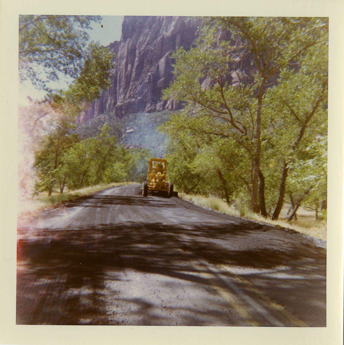 Tractor performing shoulder work along route 2 parking areas. ; ZION Museum and Archives Image 002.03.01-13of17 ; ZION 15933