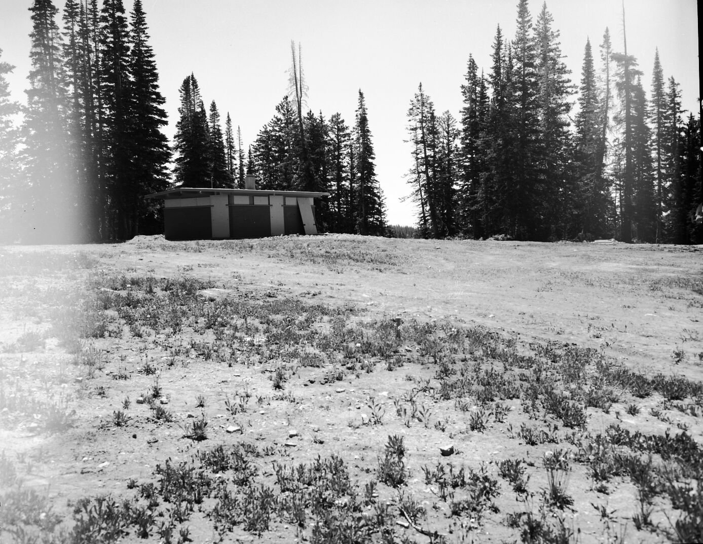 Comfort station nearing completion of construction along edge of forest. ; ZION Museum and Archives Image 13774 ; ZION 13774