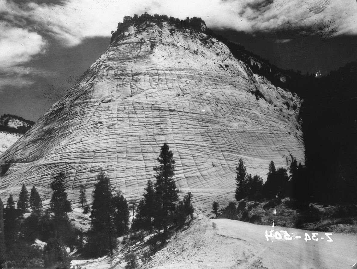 Checkerboard Mesa with the Zion-Mt. Carmel Highway in foreground. ; ZION Museum and Archives Image 10058 ; ZION 10058