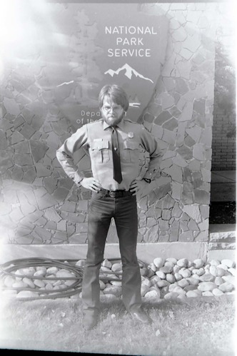 Man with beard pointing to National Park Service arrowhead. ; ZION Museum and Archives Image 402_11_13004 ; ZION 15933