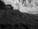 Channel change #2 before turning river through. New Civilian Conservation Corps (CCC) rock quarry opened up to complete river projects. Man on bank. ; ZION Museum and Archives Image ZION 13651 ; ZION 13651