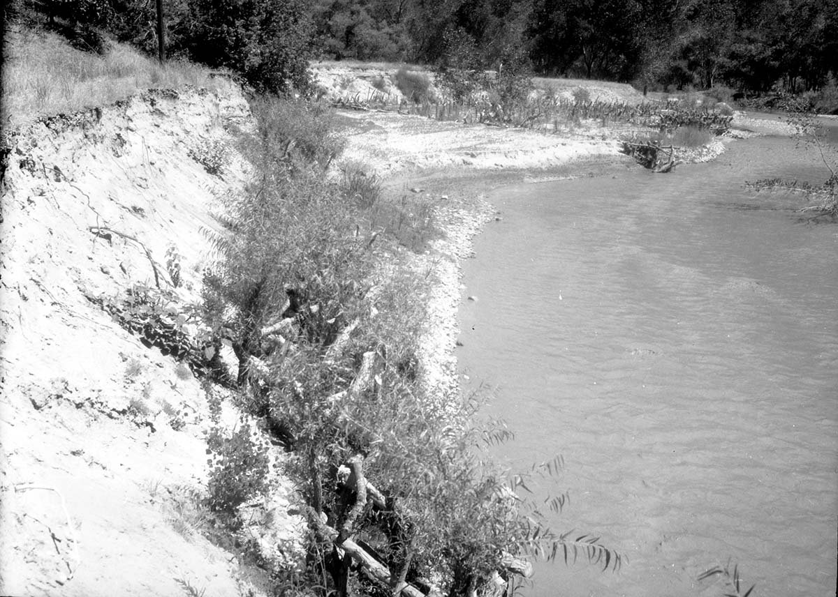 Stream bank protection along eroded stream bank, looking downstream at willow spiders along west bank of Virgin River above Court of Patriarchs. ; ZION Museum and Archives Image ZION 10316 ; ZION 10316