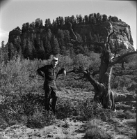 Warren Hamilton and pilot - helicopter flight to study Temple Cap formation for geology book; contact between Carmel limestone and Temple Cap formations. ; ZION Museum and Archives Image ZION 8997 ; ZION 8997