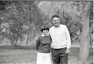 BW Photos of the Crocker/ Nicholson retirement barbeque. Superintendent Harold Grafe in apron at grill with man and woman. ; ZION Museum and Archives Image 800_04_01001 ; ZION 15933