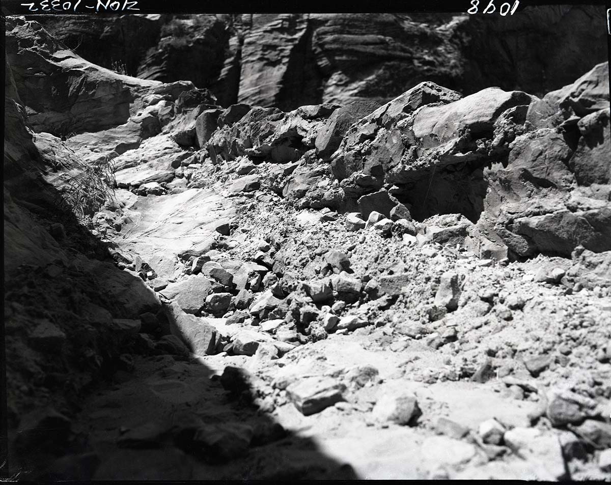 Damage done by storm of July 25, 1954 to West Rim Trail. ; ZION Museum and Archives Image 008_01_015 ; ZION 10324