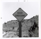 Road sign reading 'Deer Crossing' in Kolob Canyon. ; ZION Museum and Archives Image 007.01.01-43of73 ; ZION 15933