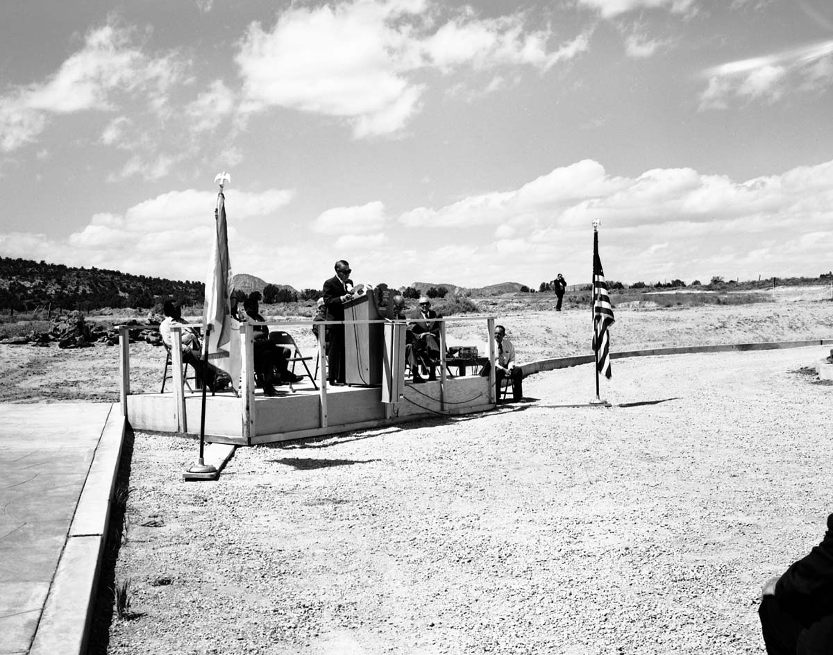 Elder Theodore M. Tuttle, general authority of Latter Day Saints (Mormon) Church, addressing visitors at the dedication of new Tribal and National Park Service Visitor Center and 50th anniversary at Pipe Spring National Monument. ; ZION Museum and Archives