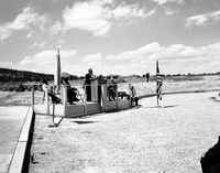 Crowd watching as Arizona Governor Jack Williams and 'Miss Fredonia' cut the ribbon at the dedication ceremony of Arizona State Highway 389, Fredonia, Arizona, August 5, 1967. ; ZION Museum and Archives Image 9600 ; ZION 9600