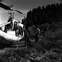 Warren Hamilton and pilot - helicopter flight to study Temple Cap formation for geology book; contact between Carmel limestone and Temple Cap formations. ; ZION Museum and Archives Image ZION 8997 ; ZION 8997