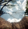 Arborist climbing tree with harness to prune branches, Bridge Mountain in background. ; ZION Museum and Archives Image 107_02_02007 ; ZION 15933