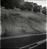 BW photos of rock slides in Kolob Canyons - 2x2. Ranger with camera reaching into crack in the road. ; ZION Museum and Archives Image 107_06_23012 ; ZION 15933