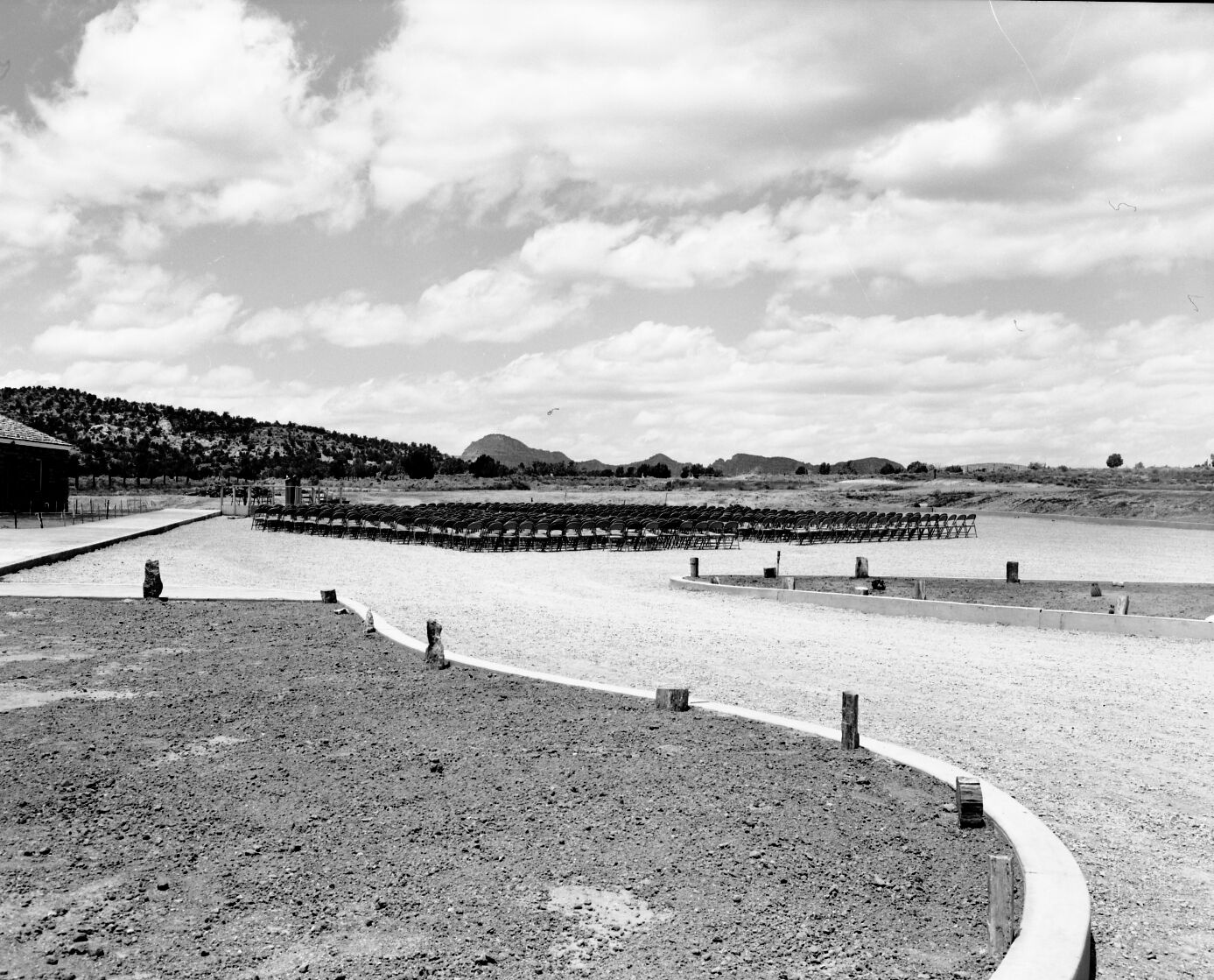 Chairs and grandstand in the parking area set up prior to dedication of new Tribal and National Park Service Visitor Center and 50th anniversary celebration at Pipe Spring National Monument. ; ZION Museum and Archives Image 9582 ; ZION 9582