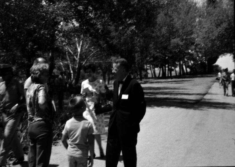 Arizona Governor Jack Williams speaking with visitors on the path at Pipe Spring National Monument following the dedication ceremony of Arizona State Highway 389, Fredonia, Arizona, August 5, 1967. ; ZION Museum and Archives Image 9602 ; ZION 9602