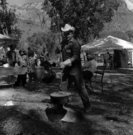 Doyle Winder lowers Dutch oven into fire pit during cooking demonstration at the second annual Folklife Festival, Zion National Park Nature Center, September 1978.