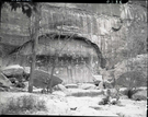 Narrows Trail construction, station 29-50, with view of dry wall, overhanging rock, and travertine limestone cut. ; ZION Museum and Archives Image 008_03_029 ; ZION 13607