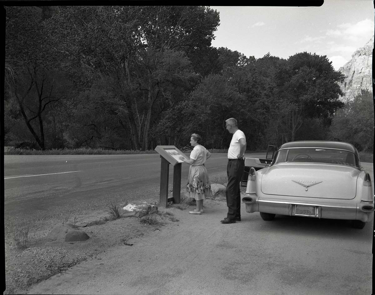 Visitor use of wayside panel exhibit at Court of the Patriarchs; man, woman, and car near sign. ; ZION Museum and Archives Image 007_01_016 ; ZION 8780