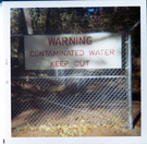 Sign reading 'Warning contaminated water keep out' near a pond of contaminated water or waste. ; ZION Museum and Archives Image 006.04.21-4of4 ; ZION 15933