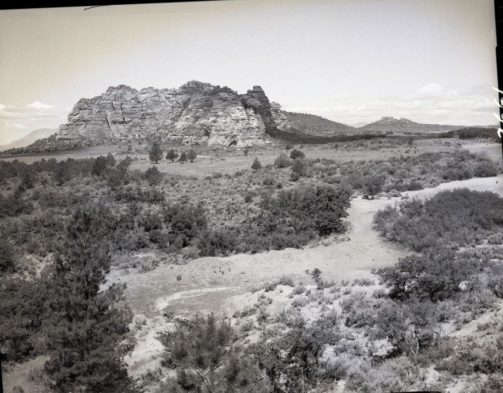 Record of vandalism, a half mile west of Neck Spring, Lee property beyond pine trees. Water matters involving Evan S. Lee. ; ZION Museum and Archives Image 101_01_026 ; ZION 8362