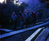 Scaffolding construction and use at the Temple of Sinawava during a spring project. ; ZION Museum and Archives Image 006.04.08-8of51 ; ZION 15933