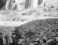 Flood damage to rock wall on Virgin River, a quarter mile south of Court of Patriarchs. Record of damage or defective workmanship. ; ZION Museum and Archives Image ZION 8607 ; ZION 15933