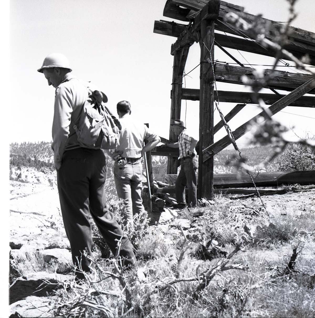 Cableworks above Zion Canyon, with William L. Crawford, and either John Winder or Mr. Rosencranz at edge of cable works, east rim of Zion Canyon. ; ZION Museum and Archives Image ZION 12423 ; ZION 12423