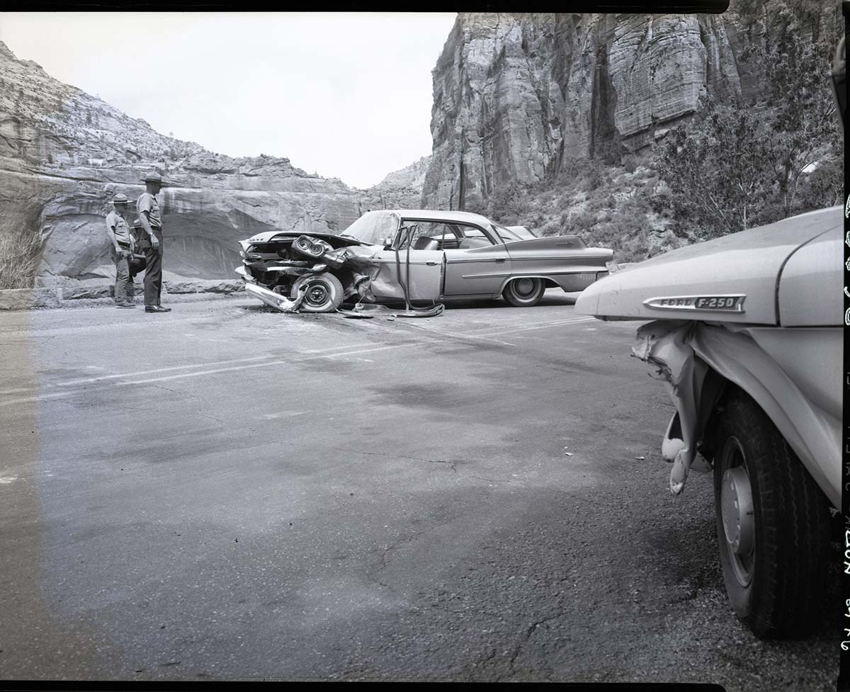 Auto accident on canyon road, a quarter mile north of Grotto Campground on August 3, 1958. ; ZION Museum and Archives Image 107_05_008 ; ZION 8457