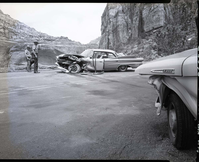 Auto accident on canyon road, a quarter mile north of Grotto Campground on August 3, 1958. ; ZION Museum and Archives Image 107_05_009 ; ZION 8458